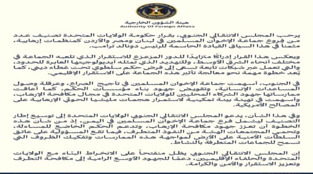 المجلس الانتقالي الجنوبي يدعو واشنطن لتوسيع قوائم الإرهاب لتشمل فرع الإخوان في اليمن
