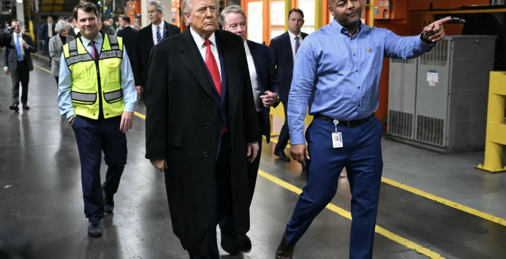 وخلال جولة في مصنع فورد إف-150 في ديترويت في ولاية ميشيغن، شوهد ترامب على ممشى مرتفع يطل على أرضية المصنع مرتديا معطفا أسود طويلا.