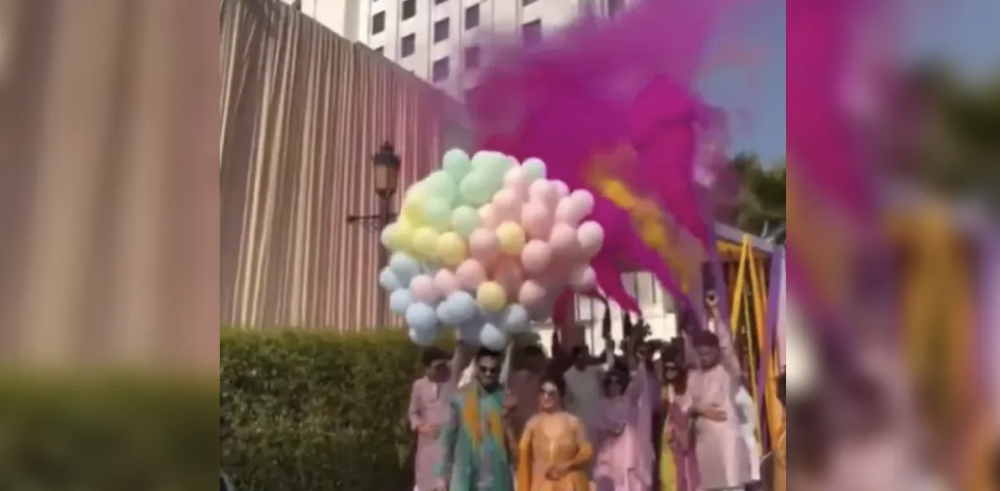 وأظهر مقطع فيديو منتشر على مواقع التواصل الاجتماعي الزوجين وهما يسيران محاطين ببالونات مملوءة بالهيدروجين.